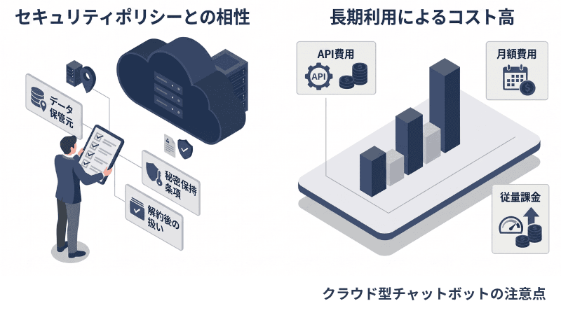 月額課金のため、長期利用になるとオンプレミスより総コストが高くなるケースがあります。特に生成AI型のチャットボットでは、月額費用とは別にAPI利用料が従量課金で発生するプランもあるため、契約形態は事前にしっかり確認しておくことが重要です。