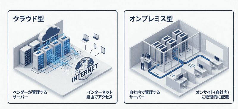 まず、クラウド型とオンプレミス型それぞれの仕組みを整理しておきます。言葉の意味を押さえておくと、自社に合った選択がしやすくなります。