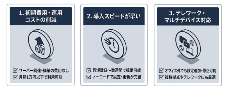 クラウド型が多くの企業に選ばれる理由は、導入のしやすさと運用のシンプルさにあります。代表的なメリットを3点ご紹介します。