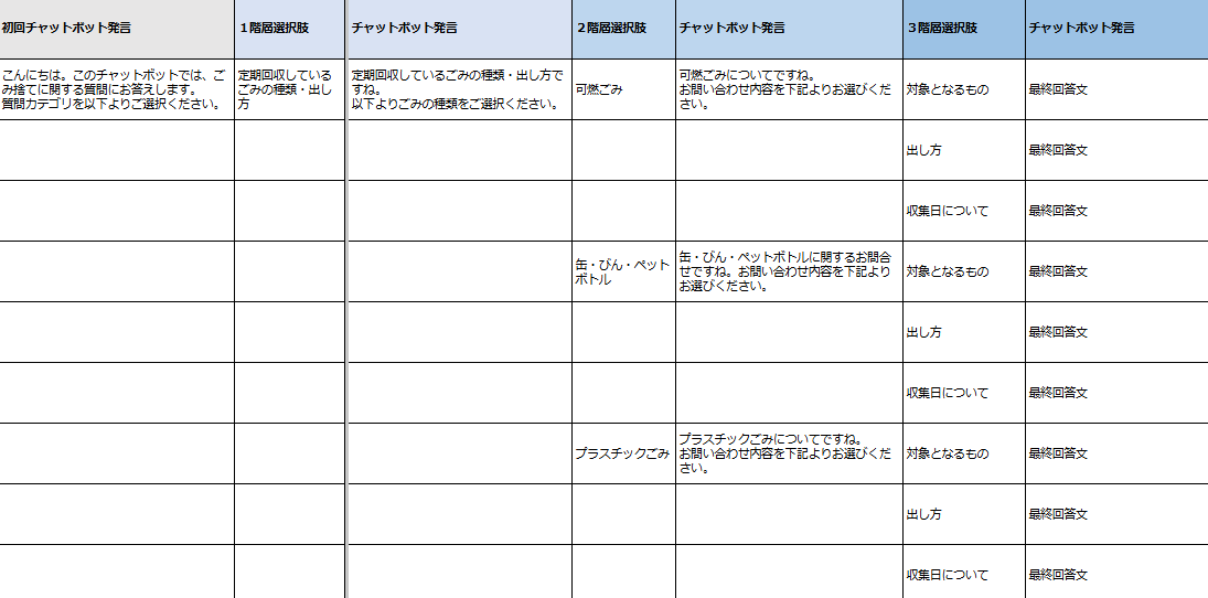 ![]() | 本記事で例としてご紹介した「ごみについて」のシナリオ設計書です。エクセル形式で、各階層ごとの質問を整理しております。 ※このシナリオで作成したデモ用チャットボットを実際にお試しいただくことも可能です。詳しくはsupport@tebot.jpへお問い合わせください。 |