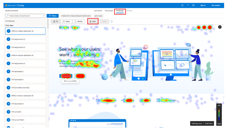 無料ヒートマップツールのMicrosoft Clarity: https://clarity.microsoft.com/