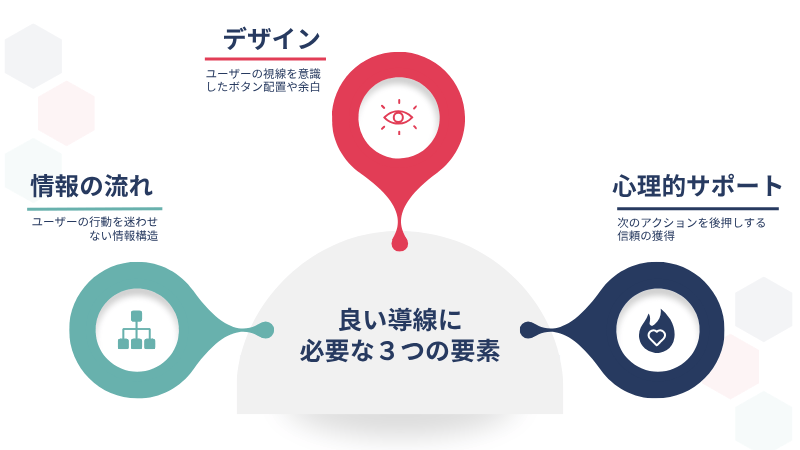 良い導線は、「情報の流れ」「デザインの誘導」「心理的なサポート」の3つの要素で構成されています。それぞれを順に見ていきましょう。