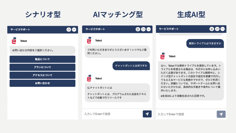 Tebotは、社内向けチャットボットの導入実績を持つAIチャットボットです。シナリオ型・AIマッチング型・生成AI型を組み合わせて使えるため、問い合わせの自動化からナレッジ化まで、目的に応じた構成を取ることができます。