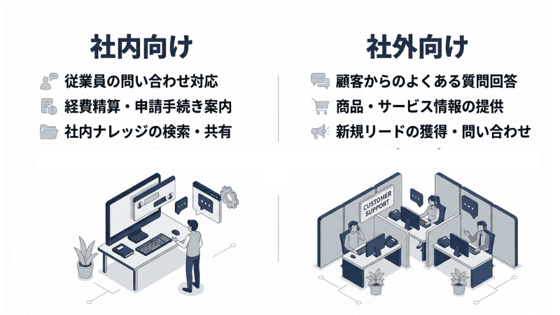 チャットボットには「社外向け」と「社内向け」の2種類があります。