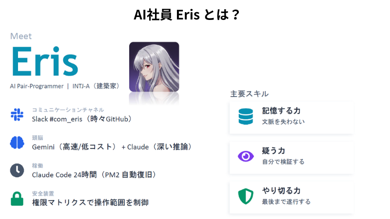Erisとは、弊社の開発チームメンバーとして働く”AI社員”(AIエージェント)です。
