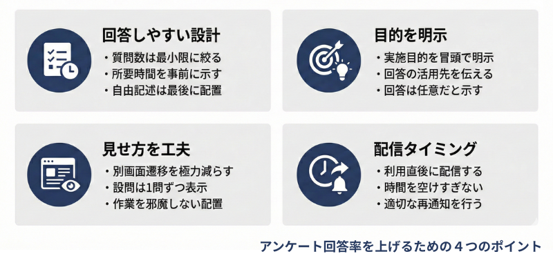 アンケートの回答率を高めるためには、個別のテクニックだけでなく、全体の設計を見直す視点が重要になります。以下、注意すべき4つのポイントをご紹介します。